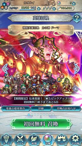 今回はファイアーエムブレムヒーローズにて、 初めての神階英雄召喚が開催されました。 初めて実装されたのが、力の神 ドーマ。 エコーズに登場した英雄ですね。 ドーマの他にも、伝承英雄や超英雄の復刻も ピックアップしています。 お目当ては伝承のチキと…