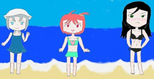 大変長らくお待たせしました! 今回は水着姿のオリキャラ三人を書きました。 こんな感じで、 サユキは帽子をかぶせました。 この年頃ではミニスカートは苦手でしたが、 水着は平気なようです。 ソニアはハートマークが付いた水着にしました。 あやめは恥ずか…